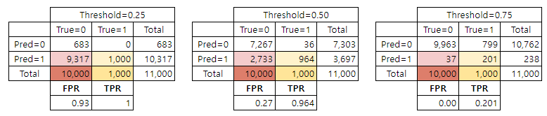 ROC, PR curve를 살펴보기 위해 위와 같이 임의로 불균형 데이터 샘플을 생성하였다 (Positive:Negative = 1,000:10,000). 이때, threshold를 0부터 0.01간격으로 증가시키면서 confusion matrix 및 각 curve 생성에 필요한 성능지표들을 계산하였다.
