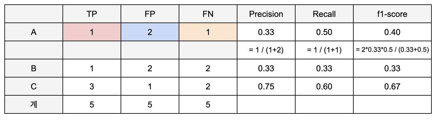 A의 경우를 예로 들어보면, A를 A로 예측한 건수는 1개 (TP), A가 아닌 것을 A로 예측한 건수는 2개 (FP), A를 A가 아닌 것으로 예측한 경우는 1개 (FN) 이다. precision은 A로 예측한 건 중 실제 A인 건의 비율이므로 0.33, recall은 실제 A 중 A로 예측된 건의 비율이므로 0.5으로 계산된다. 이를 토대로 A에 대한 f1-score는 0.4임을 알 수 있다.