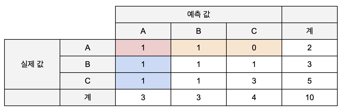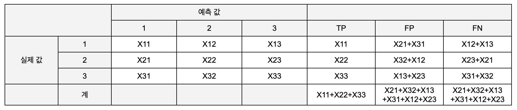 Xij (i, j = 1, 2, 3) 는 실제 i를 j로 예측한 개수를 의미한다. 왼쪽의 혼동 행렬을 참고하여 각 라벨에 대한 TP, FP, FN 을 채우면 오른쪽과 같다. TP 는 해당 라벨을 옳게 예측한 개수로 X11, X22, X33 이다. FP 는 해당 라벨로 잘못 예측한 개수, FN 은 해당 라벨을 다른 라벨로 잘못 예측한 개수를 의미한다.