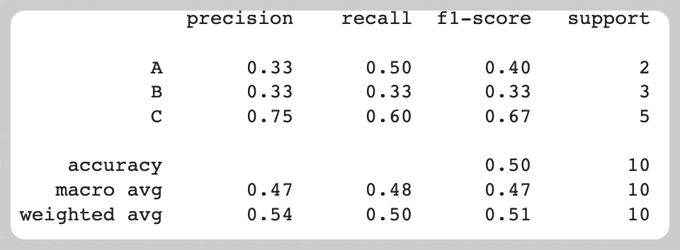 y_true = ["A", "A", "B", "B", "B", "C", "C", "C", "C", "C"]