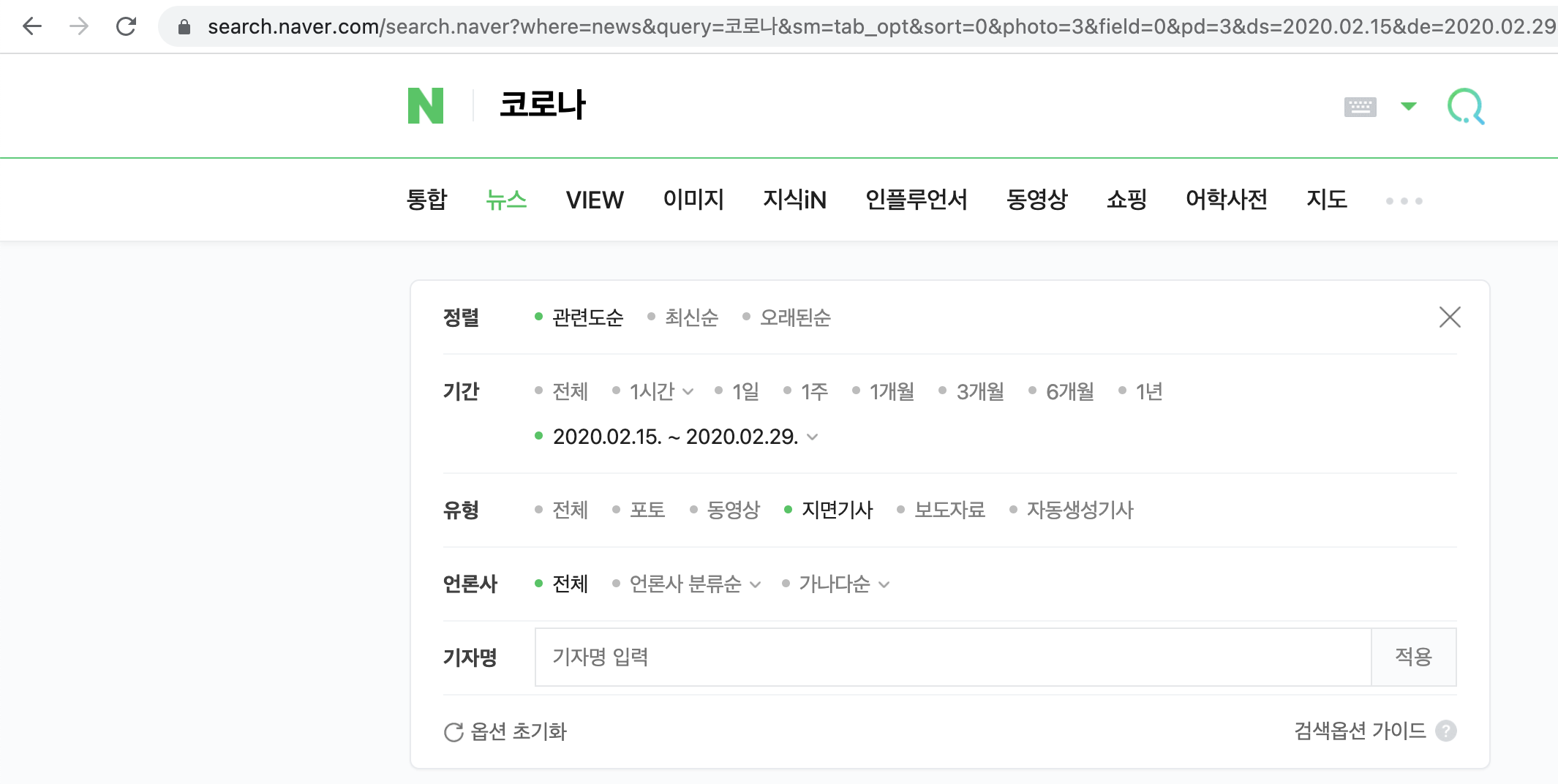 (적용 후) https://search.naver.com/search.naver?where=news&query=%EC%BD%94%EB%A1%9C%EB%82%98&sm=tab_opt&sort=0&photo=3&field=0&pd=3&ds=2020.02.15&de=2020.02.29&docid=&related=0&mynews=0&office_type=0&office_section_code=0&news_office_checked=&nso=so%3Ar%2Cp%3Afrom20200215to20200229&is_sug_officeid=0 - 해당 url로 부터 관련 기사 목록을 가져올 수 있습니다.