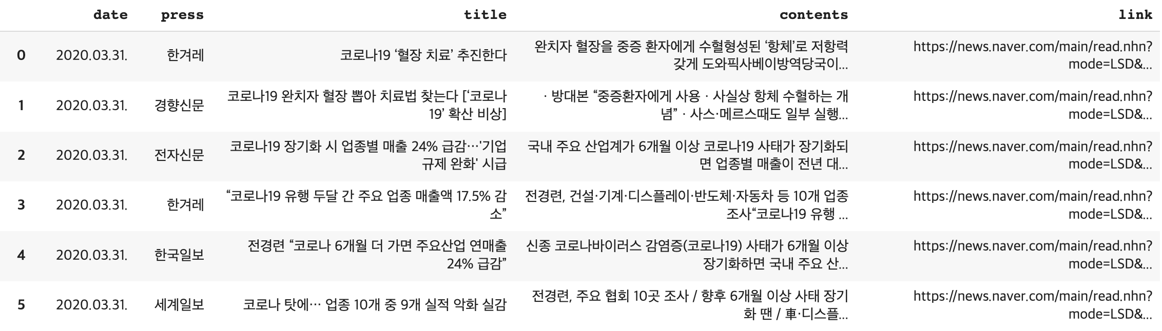 - 각 기사에서 주요 정보들만 추출하여 아래와 같이 dataframe 형태로 저장한 것을 확인할 수 있습니다.