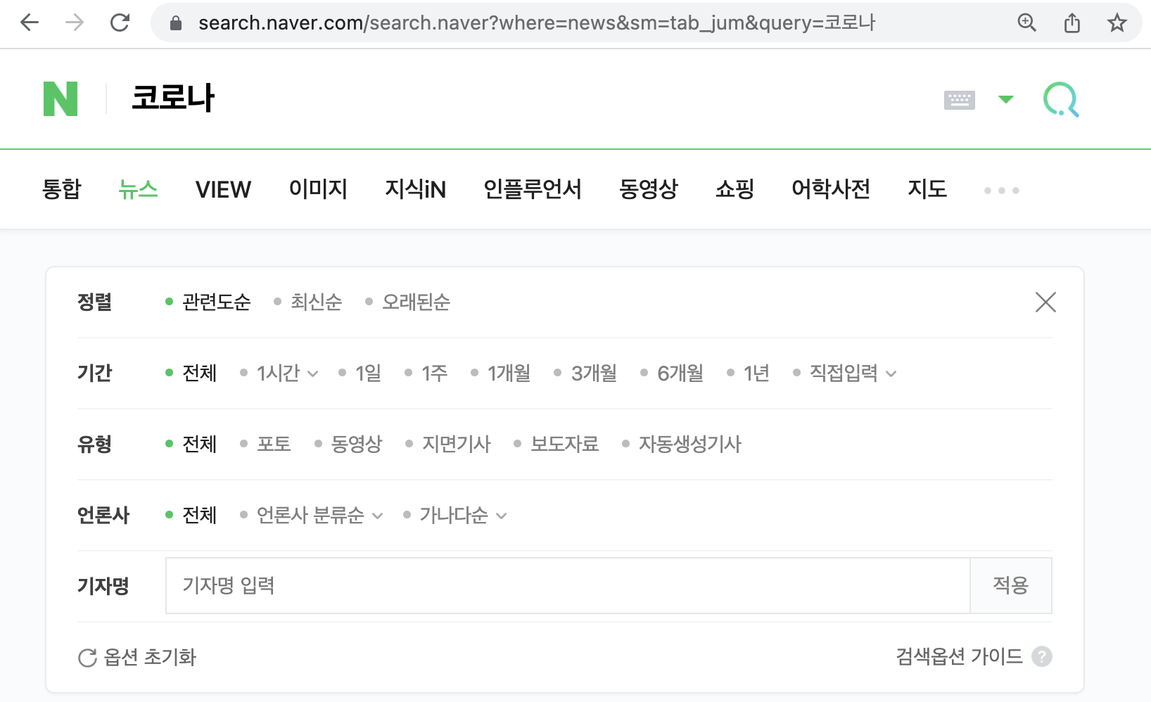 - 네이버 뉴스 탭을 보면 검색 옵션을 설정할 수 있고, 그에 따라 url이 달라집니다.