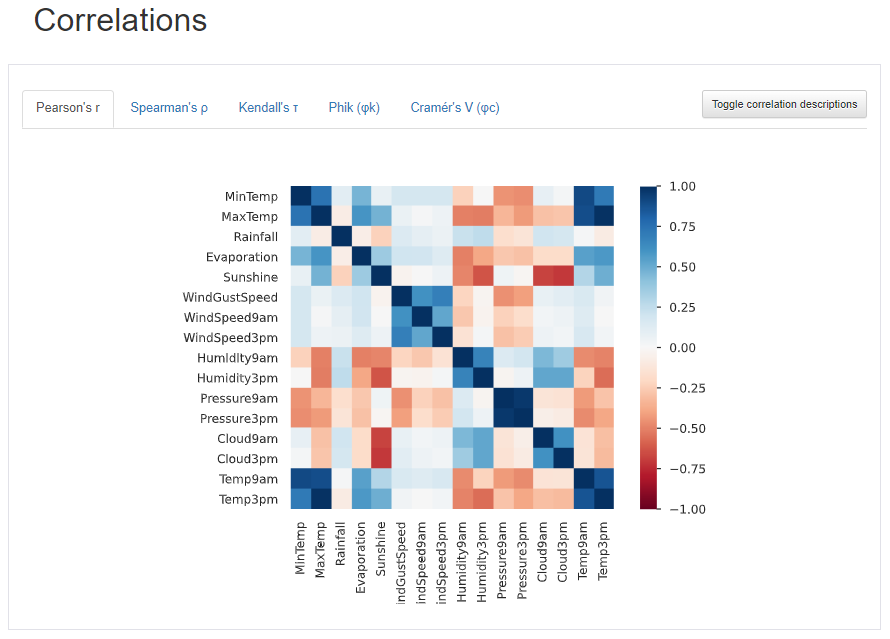 - Correlations 에서는 변수간의 상관계수를 히트맵 형태로 확인할 수 있다.